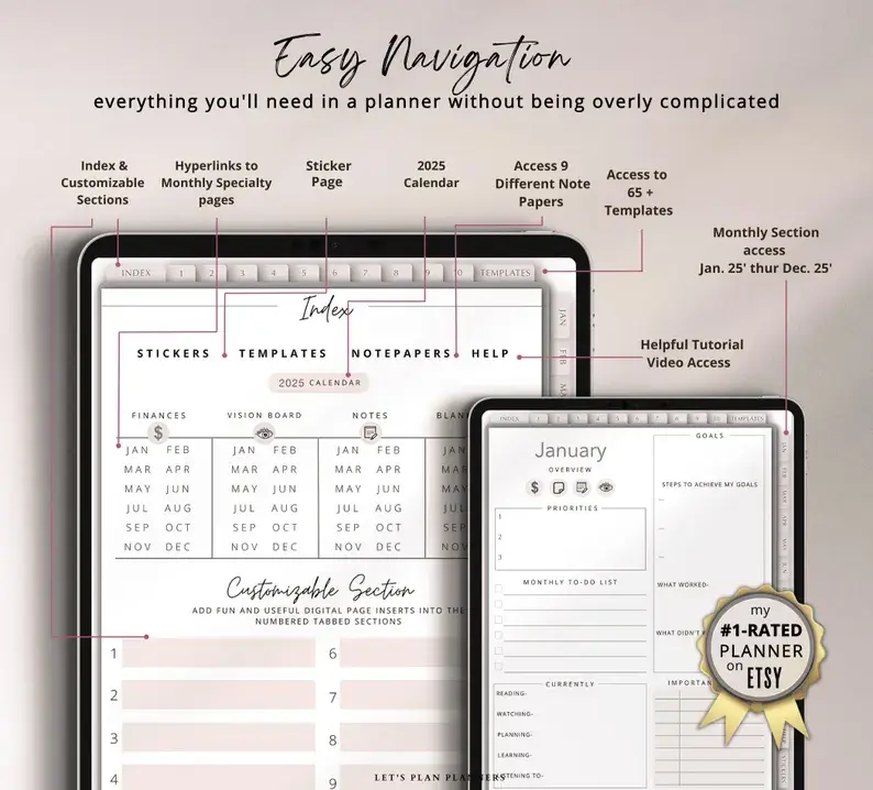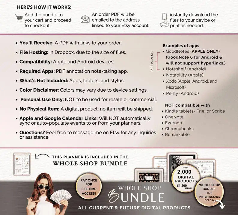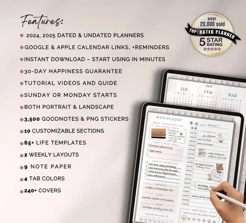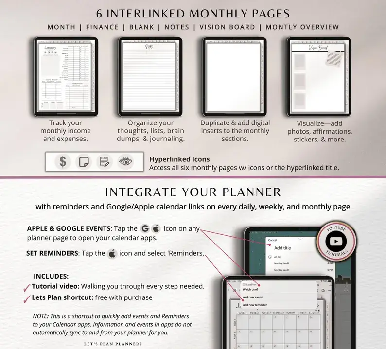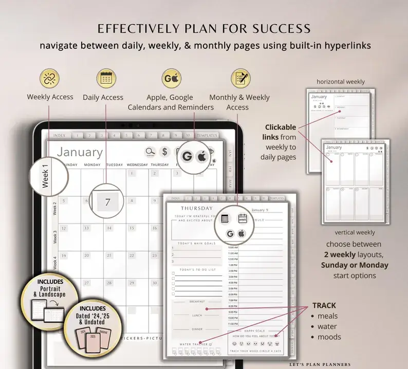 The 2025 Digital Planner is a versatile, functional template designed for iPads, tablets, and phones. It integrates with Apple and Google Calendar using a shortcut feature, helping you manage your daily, weekly, and monthly schedules more efficiently. Compatible with popular note-taking apps like Goodnotes, Noteshelf, Notability, Xodo, and Penly.