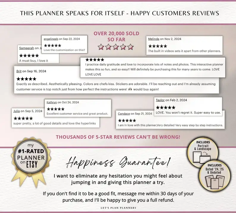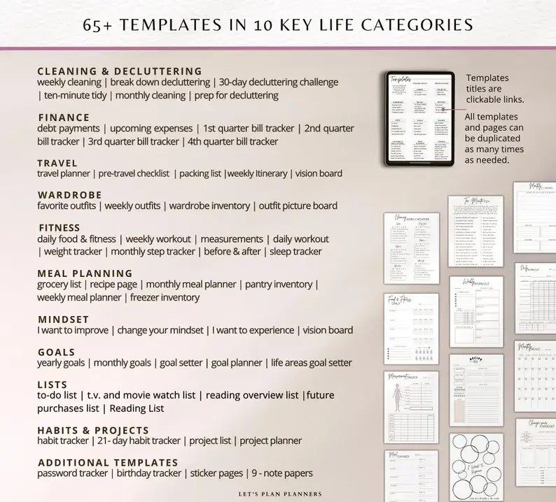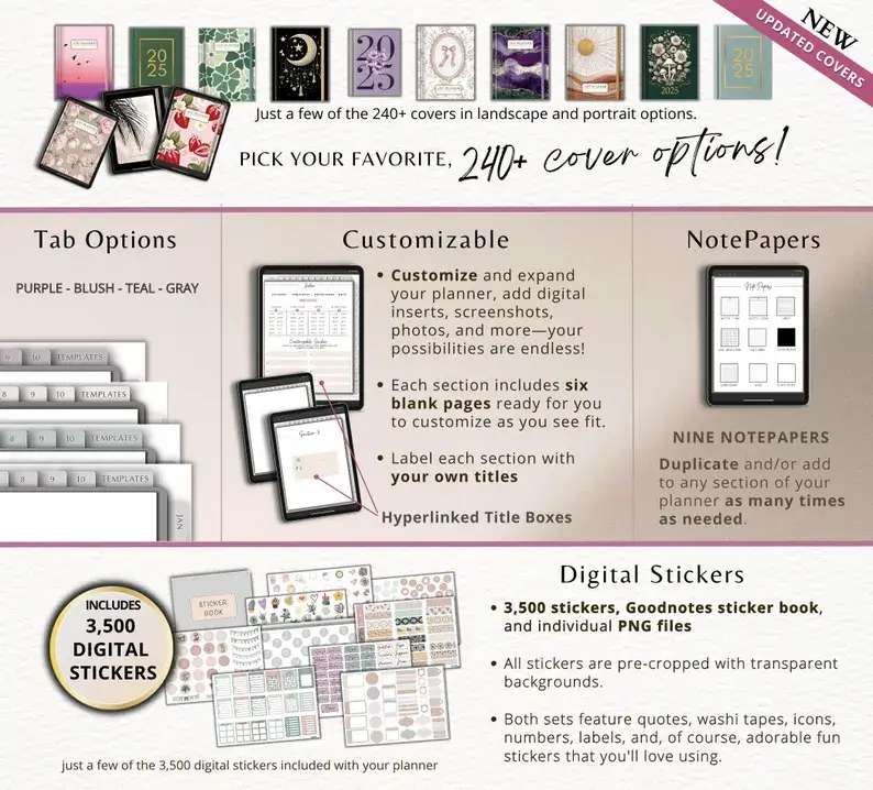 Personalize your planner with 240+ cover options and explore 65+ templates across key planning categories. Both vertical and horizontal weekly layouts are included. You’ll find 12 monthly spreads, 72 weekly pages, 449 daily pages, and plenty of extras like: